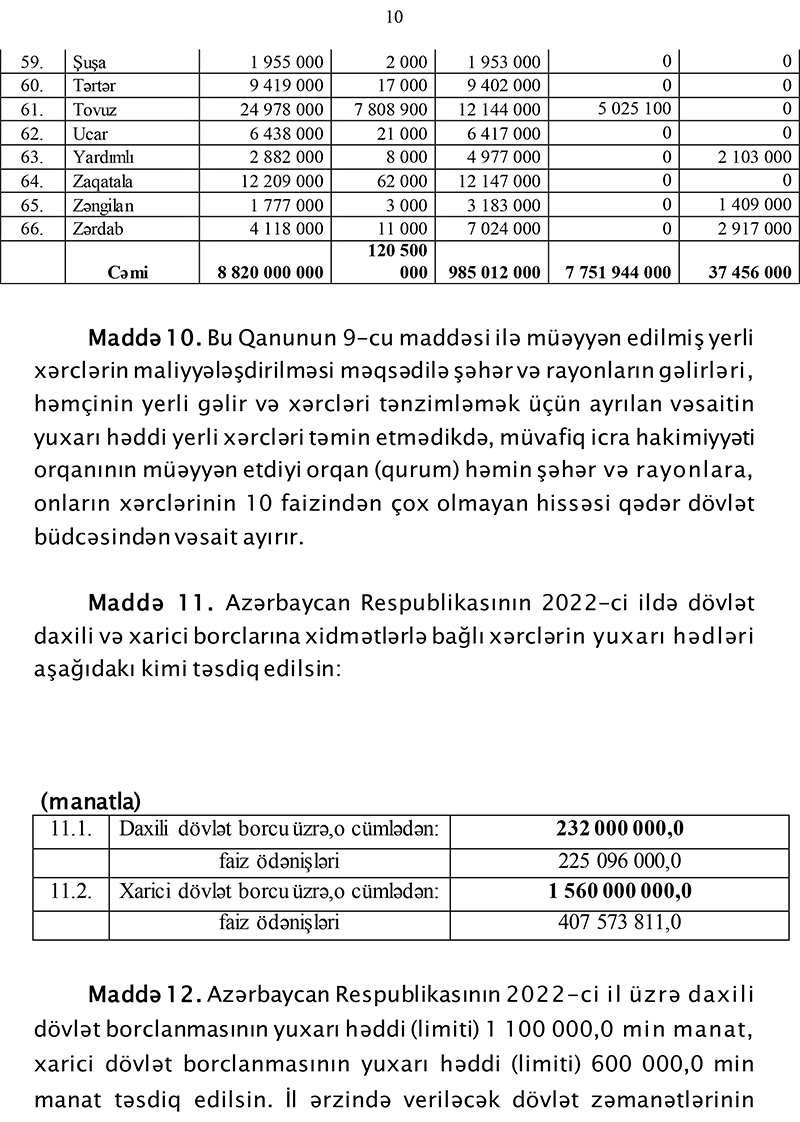 Marja xəbər verir ki, Azərbaycan Respublikasının 2022-ci il dövlət büdcəsinin gəlirləri 26 milyard 816 milyon manat, xərcləri 29 milyard 879 milyon manat (o cümlədən, mərkəzləşdirilmiş gəlirləri 25 milyard 868 milyon 444 min manat, yerli gəlirləri 947 milyon 556 min manat, mərkəzləşdirilmiş xərcləri 28 milyard 893 milyon 988 min manat, yerli xərcləri 985 milyon 12 min manat) məbləğində təsdiq edilib.
