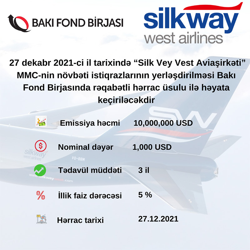 27 dekabr 2021-ci il tarixində “Silk Vey Vest Aviaşirkəti” MMC-nin növbəti 10 milyon dollarlıq istiqrazlarının yerləşdirilməsi Bakı Fond Birjasında rəqabətli hərrac üsulu ilə həyata keçiriləcək.