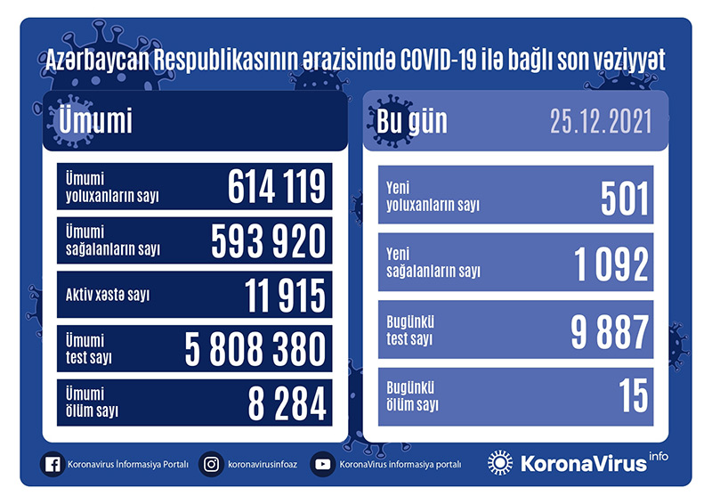 Xatırladaq ki, 24 Dekabr 2021-ci il tarixində 559 yoluxma faktı və 12 ölüm qeydə alındığı açıqlanmışdı. 13 Dekabr 2020-ci il tarixində açıqlanmış fakt (4451) bugünədək qeydə alınmış ən yüksək günlük yoluxma sayı idi.