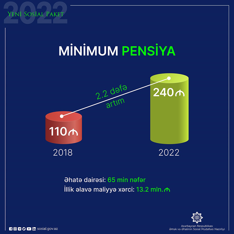 Əmək vəƏhalinin Sosial Müdafiəsi Nazirliyinin yaydığı məlumatda bildirilir ki, minimum pensiyanın artırılması 65 min pensiyaçını əhatə edəcək. Onlardan 44 min şəxsin pensiyaları artırılaraq 240 manata çatdırılacaq. Digərləri isə il ərzində pensiyaya çıxacaq şəxslər olacaq ki, onlara təyin edilən pensiyanın minimum məbləği artıq 200 deyil, 240 manat təşkil edəcək. Artım üçün illik 13,2 milyon manat əlavə vəsait ayrılacaq.