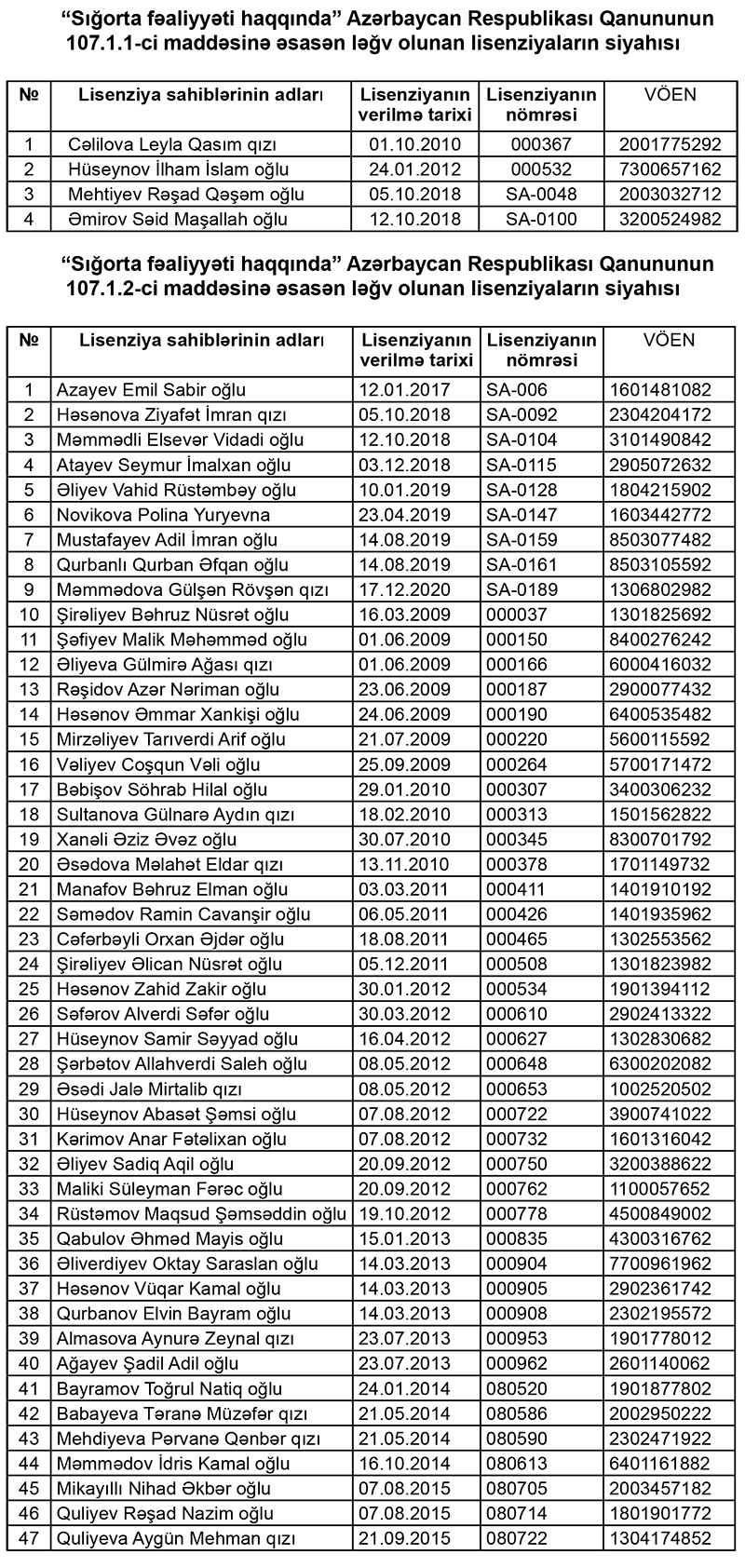Bundan əlavə, idarə heyətinin eyni tarixli qərarı ilə lisenziya sahiblərinin lisenziyalarının qüvvəsinin dayandırılmasına əsas olan halların müəyyən edilmiş müddətdə aradan qaldırılmadığı nəzərə alınaraq qanunun 107.1.2-ci maddəsinə əsasən 47 nəfər fiziki şəxsə sığorta agenti fəaliyyətinə verilmiş lisenziyalar ləğv edilib.
