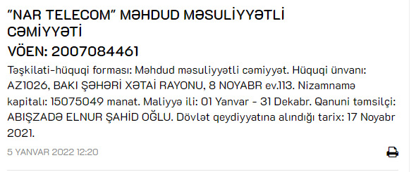 "Nar Telecom" şirkətinin hüquqi ünvanı Bakı, Xətai rayonu, 8 Noyabr ev 113.-dür.