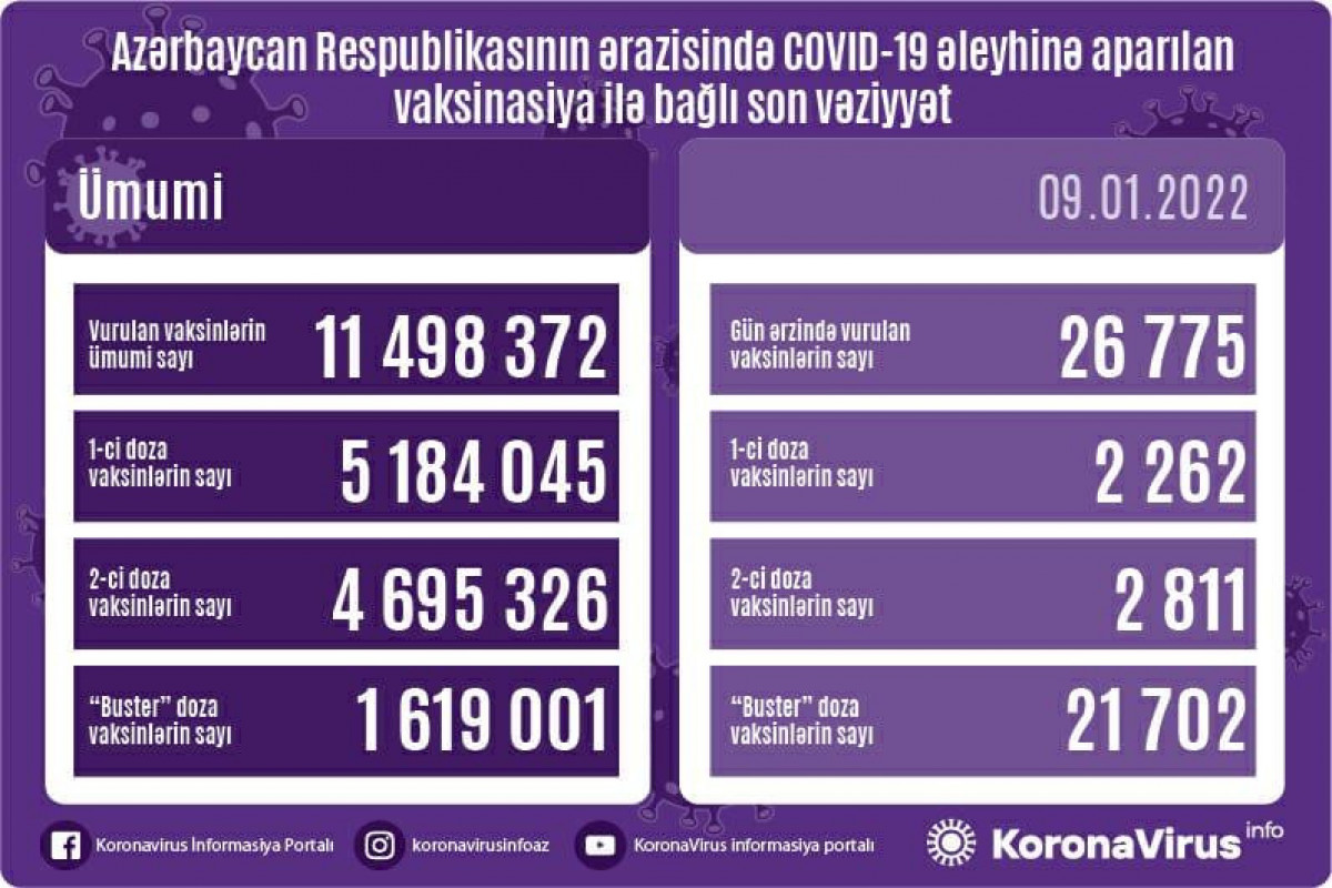 Azərbaycanda son sutkada koronavirus (COVID-19) əleyhinə 26 775 vaksin vurulub. Bir gündə birinci mərhələ üzrə vaksinasiya olunanların sayı 2 262, ikinci mərhələ üzrə vaksinasiya olunanların sayı 2 811, buster doza üzrə vaksinasiya olunanların sayı isə 21 702 nəfərdir.