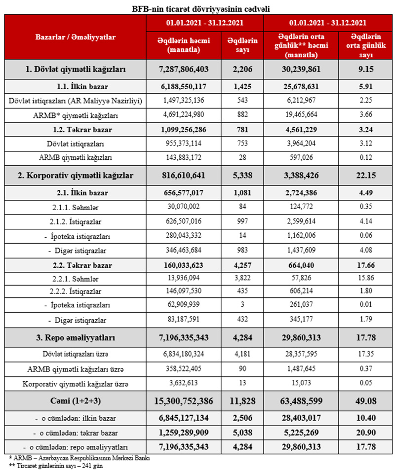 2021-ci ildə Bakı Fond Birjasında qiymətli kağızlar üzrə keçirilən əməliyyatların ümumi həcmi 15 milyard 300 milyon 752 min 386 manat təşkil edib.