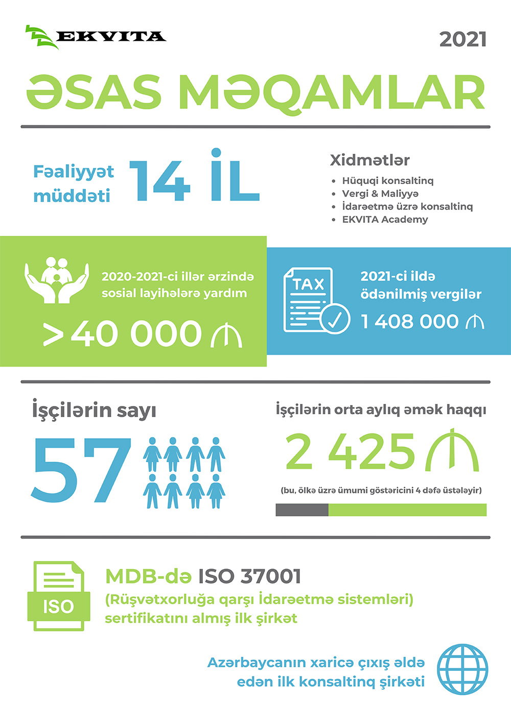 - Daha konkret olması üçün rəqəmlərə nəzər salaq. Məsələn, təkcə ötən il biz dövlət büdcəsinə ümumilikdə 1.408.326 manat vergi ödəmişik. Hal hazırda EKVİTA-da 60-a yaxın peşəkar çalışır. Hələ buraya müddətli layihələrə cəlb etdiyimiz yüzdən artıq kənar ekspertlər daxil deyil. İşçilərimizin orta aylıq əmək haqqı 2 min 425 manat təşkil edir ki, bu da ölkə üzrə orta aylıq əmək haqqından 3.4 dəfə çoxdur.