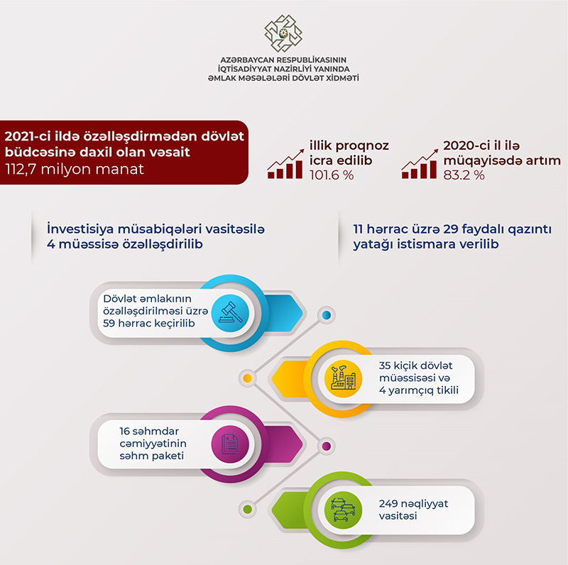 2021-ci ildə özəlləşdirmədən dövlət büdcəsinə daxilolmalar 112,7 milyon manat təşkil edib və illik proqnoz 101.6% icra olunub. Bu, 2020-ci ilin göstəricisindən 51,2 milyon manat və ya 83.2% çoxdur.