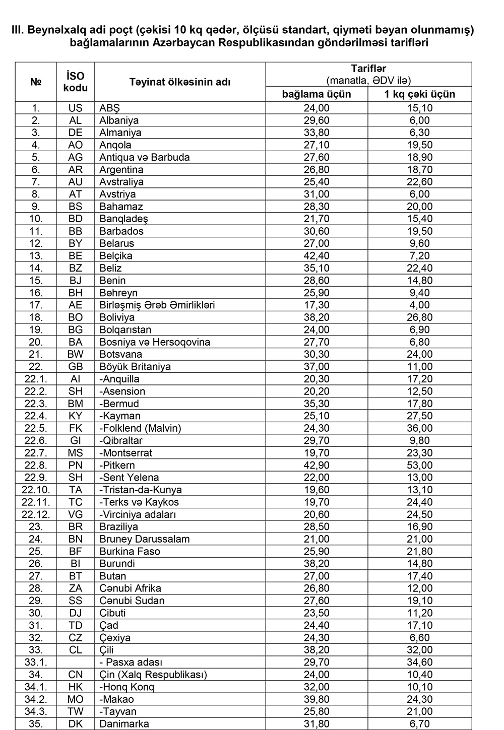 Marja.az xəbər verir ki, qərar ilə, Azərbaycan Respublikası Rəqəmsal İnkişaf və Nəqliyyat Nazirliyinin strukturuna daxil olmayan tabeliyindəki “Azərpoçt” Məhdud Məsuliyyətli Cəmiyyəti (Milli poçt operatoru) tərəfindən göstərilən universal poçt rabitəsi xidmətlərinin tarifləri təsdiq edilsin (əlavə olunur ).