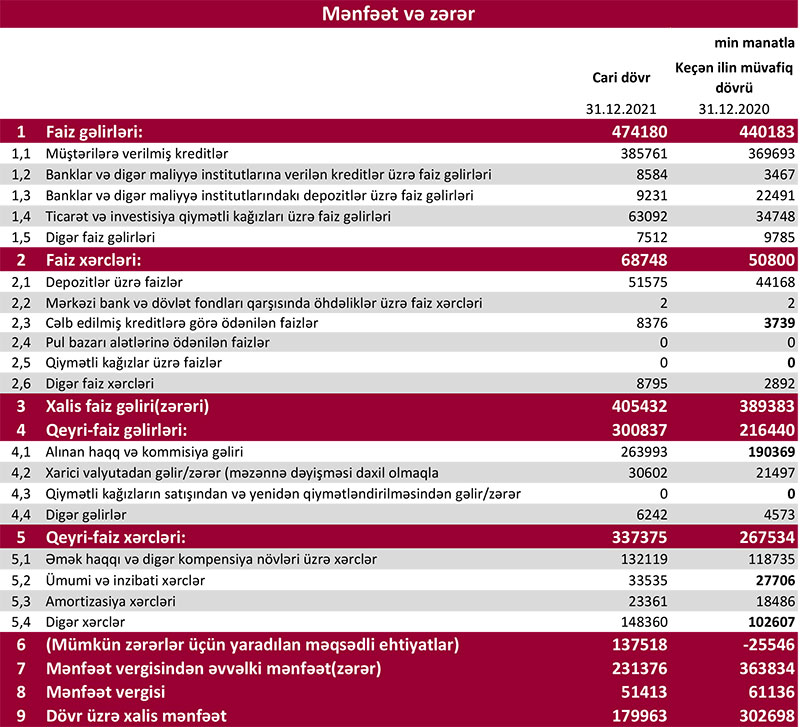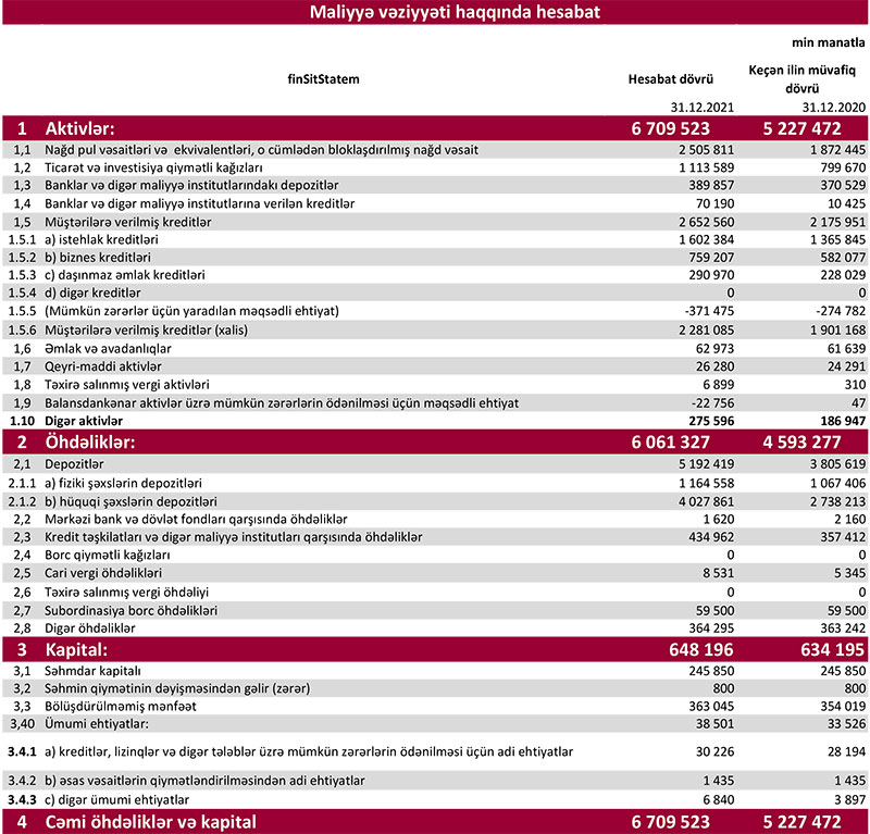 "Kapital Bank" ASC 2021-ci il üzrə əsas maliyyə göstəricilərini açıqlayıb.