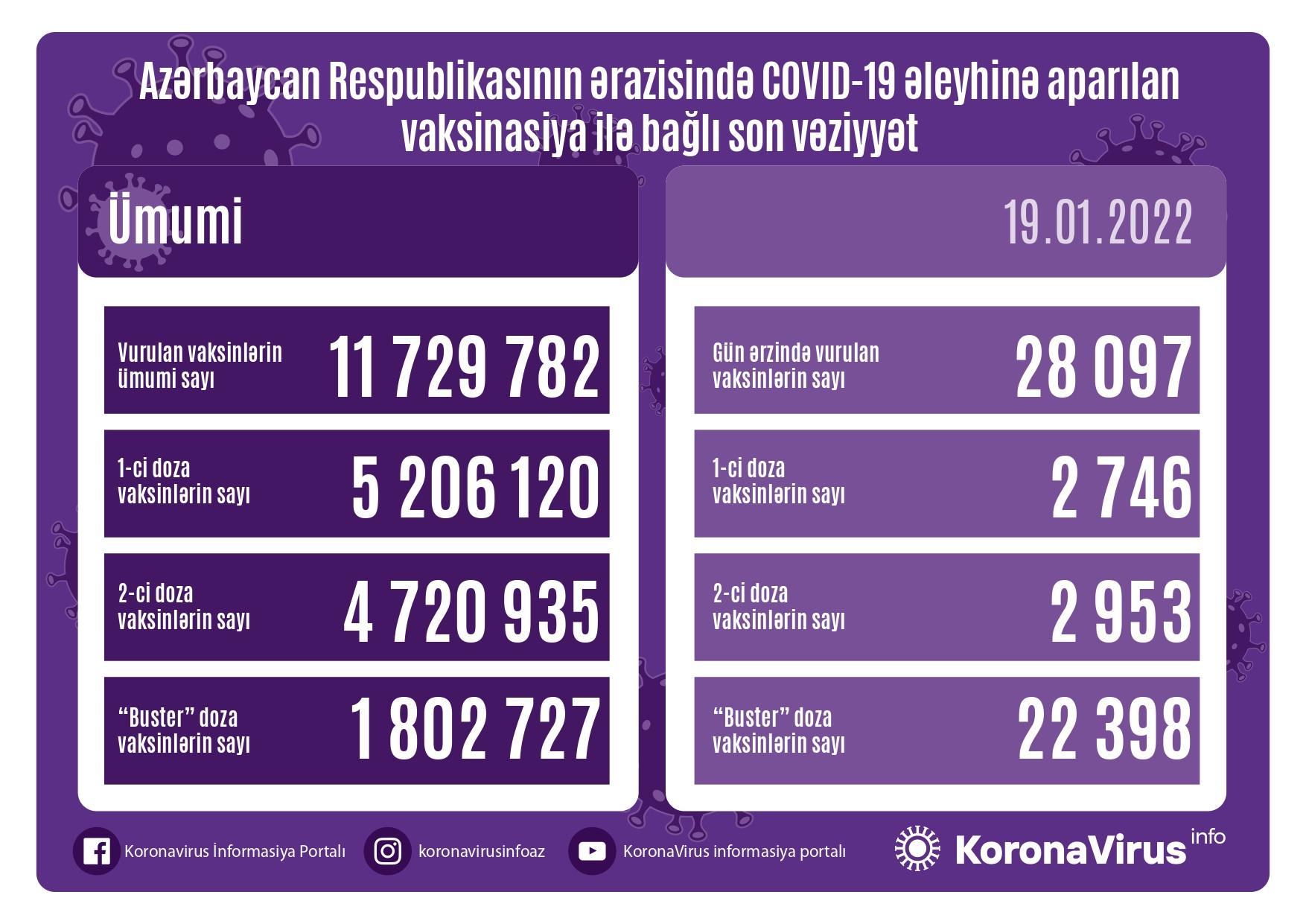 Azərbaycanda son sutkada koronavirus (COVID-19) əleyhinə 28 097 vaksin vurulub. Bir gündə birinci mərhələ üzrə vaksinasiya olunanların sayı 2 746, ikinci mərhələ üzrə vaksinasiya olunanların sayı 2 953, buster doza üzrə vaksinasiya olunanların sayı isə 22 398 nəfərdir.