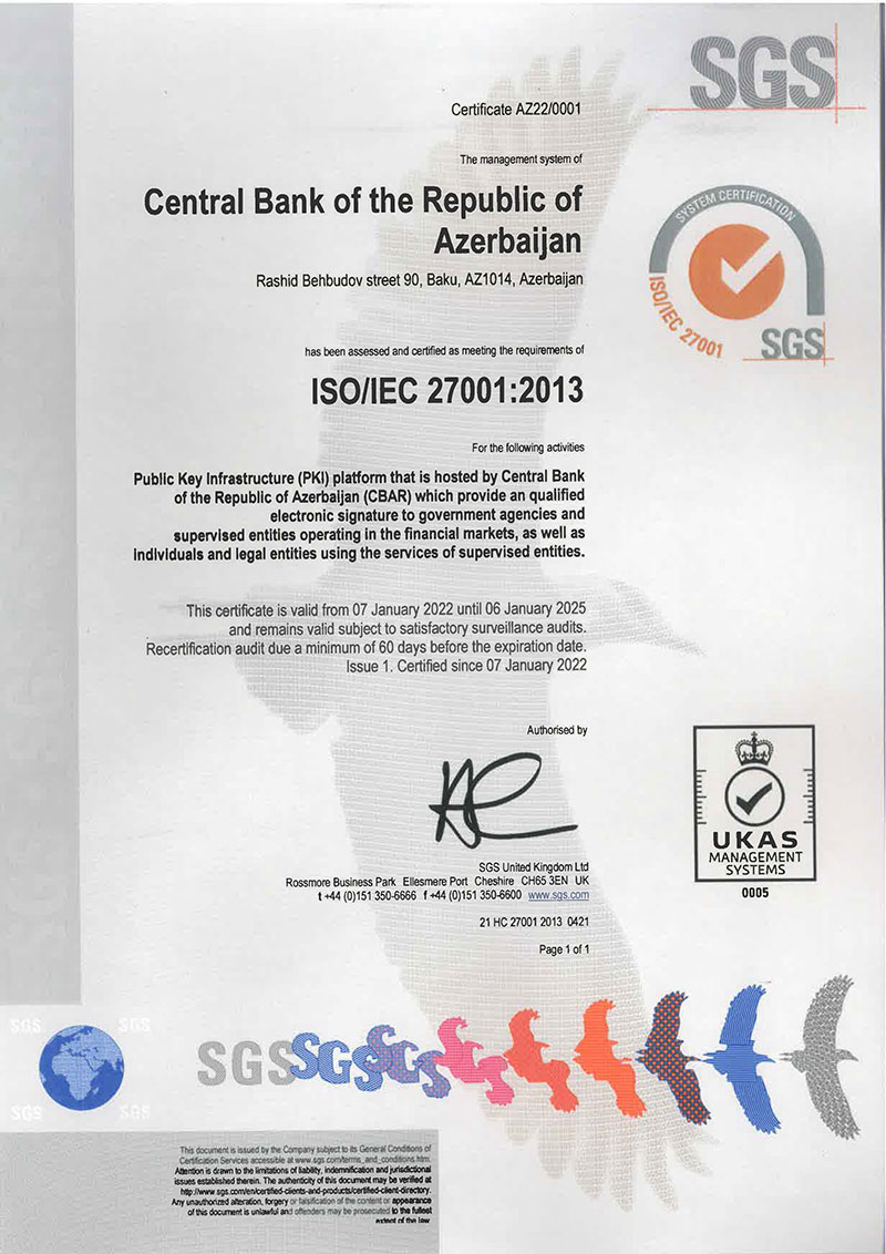 Mərkəi Bankın yaydığı məlumatda bildirilir ki, bu sahədə aparılan davamlı təkmilləşmə işləri çərçivəsində Rəqəmsal İnkişaf və Nəqliyyat Nazirliyi tərəfindən akkreditə edilmiş və Mərkəzi Bankın operatoru olduğu Bank Sertifikat Xidmətləri Mərkəzinin (BSXM) informasiya təhlükəsizliyinin idarə edilməsi üzrə ISO/IEC 27001:2013 beynəlxalq standartının tələblərinə uyğunluğu baxımından “Societe Generale de Surveillance” təşkilatı tərəfindən geniş təhlili və diaqnostikası aparılmışdır. Aparılan audit nəticəsində Mərkəzi Bankda İnformasiya Təhlükəsizliyinin İdarəetmə Sisteminin və BSXM-in ISO/IEC 27001:2013 beynəlxalq standartının tələblərinə cavab verdiyi təsdiq edilmiş və müvafiq sertifikat təqdim olunmuşdur.