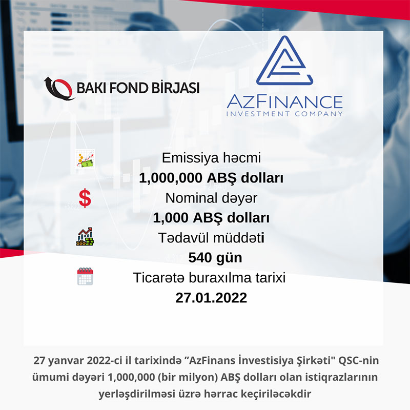 24 yanvar 2022-ci il tarixində Bakı Fond Birjasının (BFB) Listinq Komitəsinin qərarı ilə “AzFinance İnvestisiya Şirkəti” QSC-nin ümumi dəyəri 1 milyon ABŞ dolları həcmində olan istiqrazları standart bazar seqmentində listinqə daxil edilib.