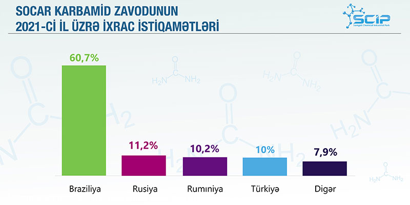 Müəssisədə istehsal olunan karbamid gübrəsi daxili bazarla yanaşı, xarici bazarlara da çıxarılır. Zavodun məhsullarının 87%-i Braziliya, Türkiyə, Rumıniya, Rusiya, Bolqarıstan, Albaniya, İtaliya, Gürcüstan və s. ölkələrə ixrac olunur.