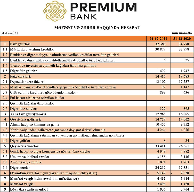“Premium Bank” 2021-ci ili mənfəət ilə başa vurub