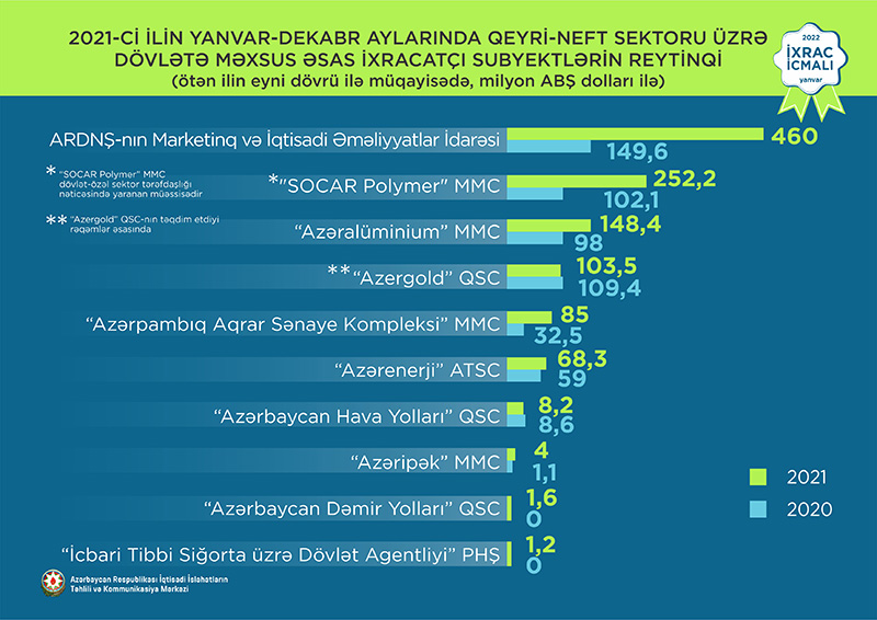 2021-ci ilin yanvar-dekabr ayları üzrə hazırlanan qeyri-dövlət ixracatçı subyektlərin reytinqində ilk onluqda aşağıdakı şirkətlər təmsil olunurlar: “MKT İstehsalat Kommersiya” MMC, “Azərbaycan İnterneyşnl Mayninq Kompani Limited Şirkəti”nin Azərbaycan Respublikasındakı Nümayəndəliyi, “Local Garden” Məhdud Məsuliyyətli Cəmiyyəti, “Baku Steel Company” MMC, “P-Aqro” MMC, “Sun Food” MMC, Hidayətov Təyyar Hidayət oğlu, “Azərbaycan Şəkər İstehsalat Birliyi” MMC, “Çinar Aqro” MMC, “RAM Beynəlxalq Nəqliyyat və Ticarət LTD” MMC.