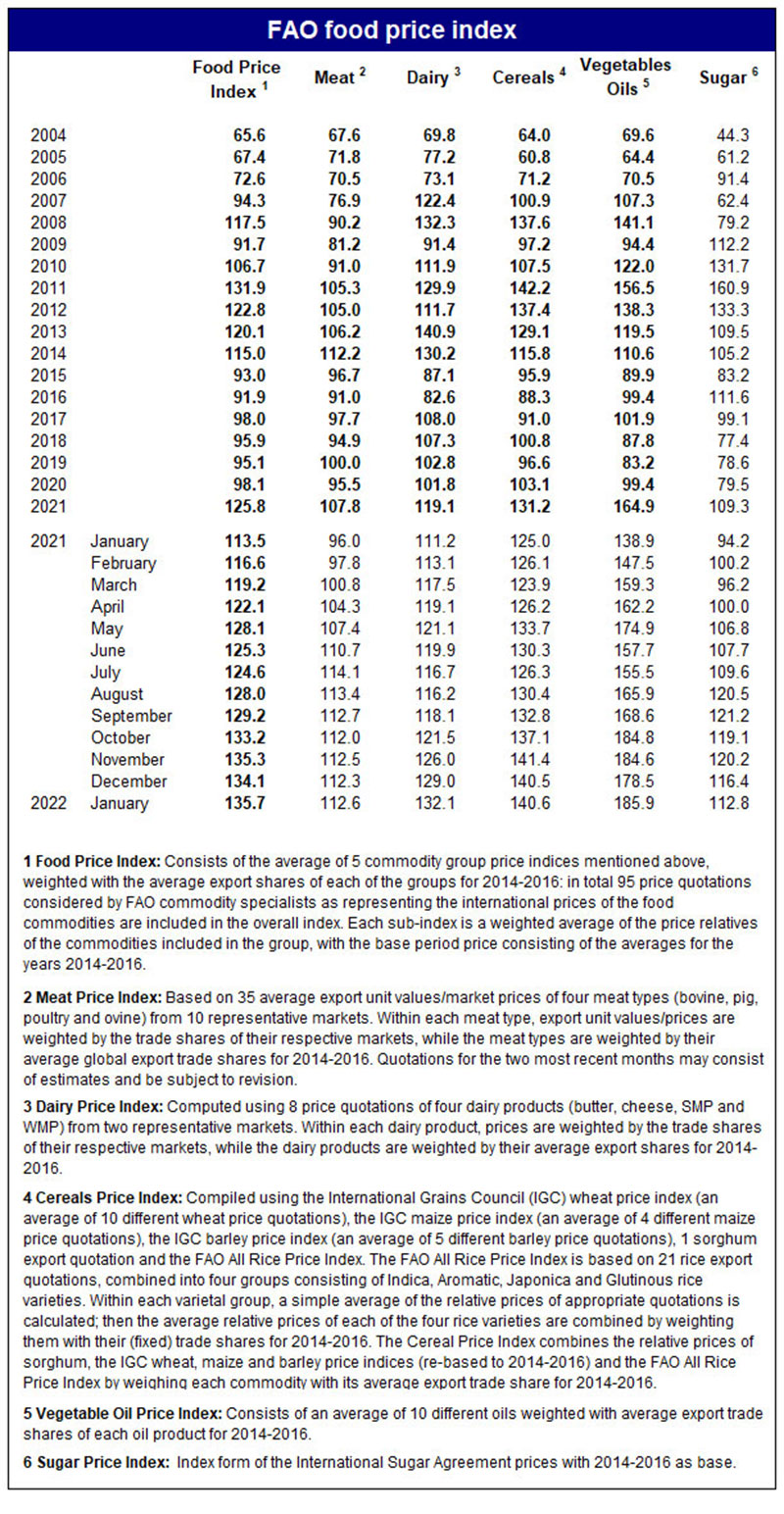 FAO-nun Ərzaq Qiymətləri İndeksi yanvarda aylıq müqayisədə 1,1%, illik müqayisədə isə 19,6 faiz artıb.