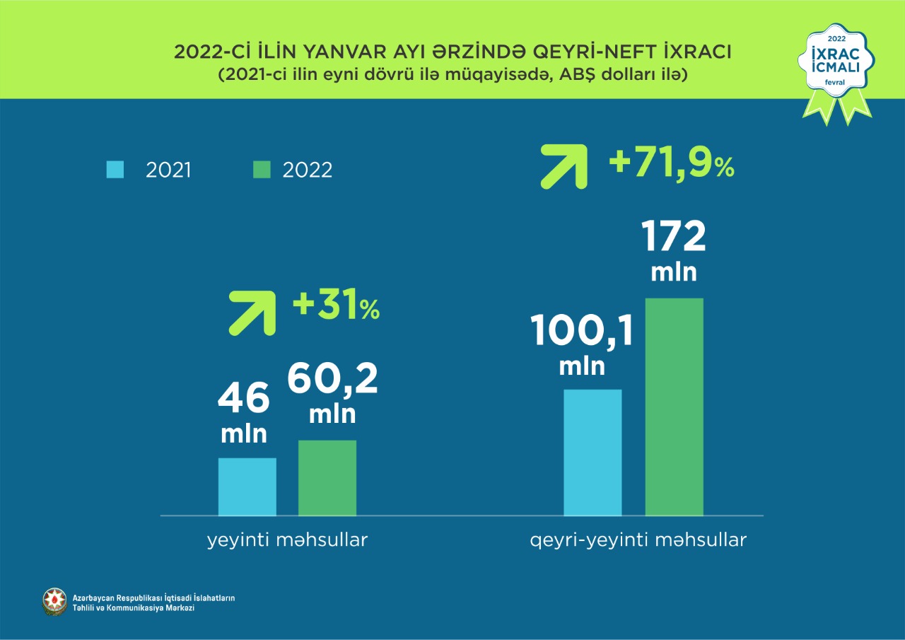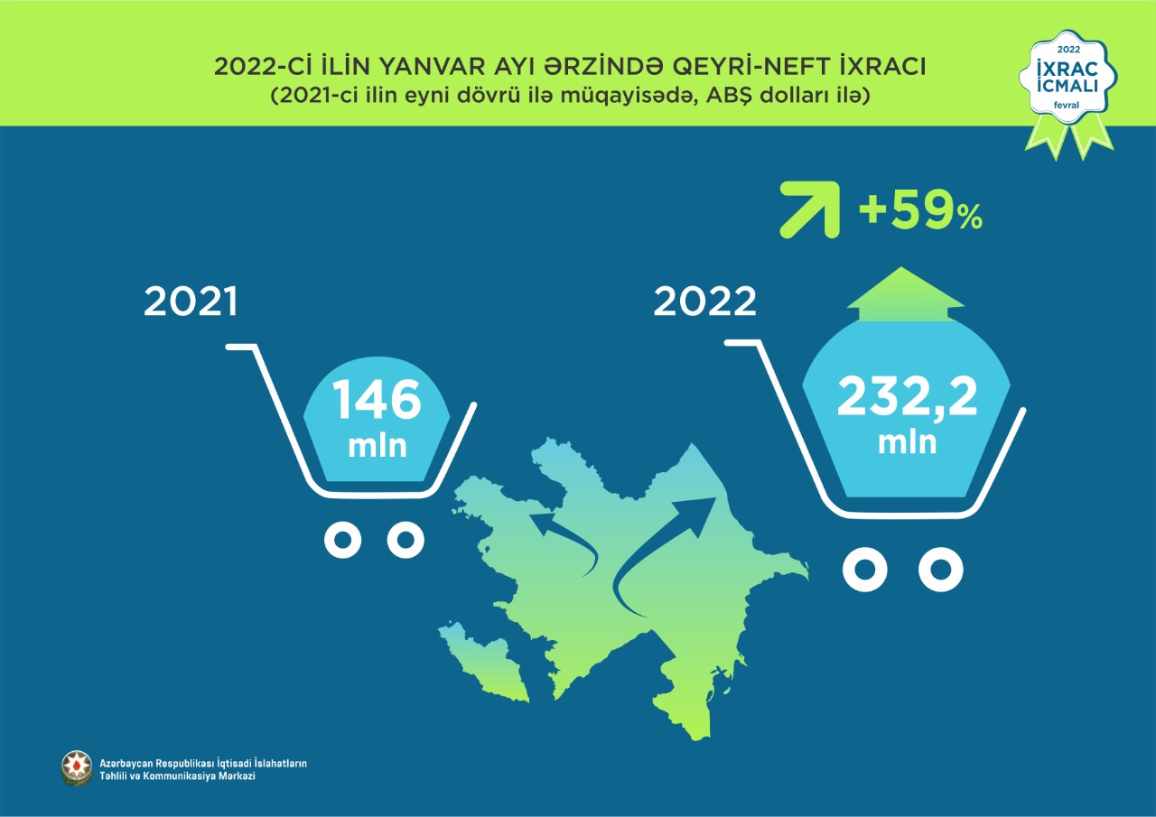 “İxrac icmalı” nın fevral sayına əsasən, 2022-ci ilin yanvar ayı ərzində Azərbaycanın ixracı 3,1 mlrd. ABŞ dolları, qeyri-neft sektoru üzrə 232,2 mln. ABŞ dolları təşkil edib. Qeyri-neft sektoru üzrə ixrac 2021-ci il ilə müqayisədə 86,2 mln. ABŞ dolları və ya 59% artıb.