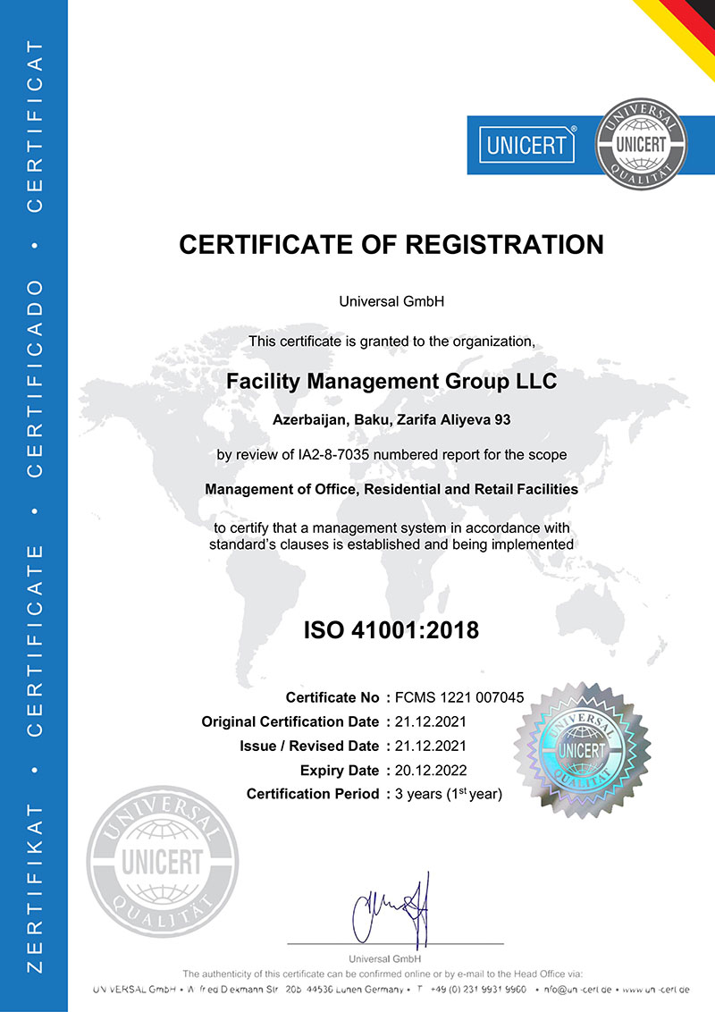 (®) “Facility Management Group” şirkəti Daşınmaz Əmlakların İdarəetmə Sistemi sahəsində ISO 41001:2018 Standartı üzrə sertifikat ilə təltif olunub. 21 dekabr 2021-ci il tarixində təqdim edilən sertifikat şirkətdə Beynəlxalq Standartlaşdırma Təşkilatının (İSO) tələblərinə cavab verən idarəetmə sisteminin yaradılıb, tətbiq edildiyinin əyani sübutudur.