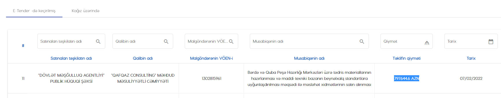 Marja.az xəbər verir ki, qalib şirkət "QAFQAZ CONSULTİNG" MMC-dir.