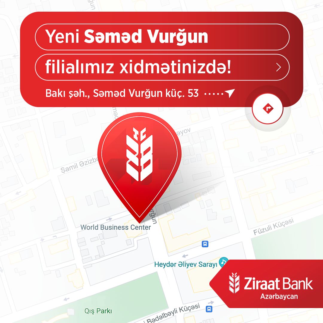 Bankdan təqdim edilən məlumata əsasən şəhərin mərkəzində - Səməd Vurğun küç., 53 (World Business Center-in 1-ci mərtəbəsi) ünvanında yerləşən Səməd Vurğun filialı müasirliyi və funksionallığı ilə yanaşı, digər filiallar kimi bankın “Bir Bankdan Daha Artıq” şüarına uyğun olaraq xidmət göstərəcəkdir. Ziraat Bank Azərbaycanın Səməd Vurğun filialı, istər hüquqi, istərsə də fiziki şəxslərə geniş çeşidli bank xidmətlərini göstərəcək.