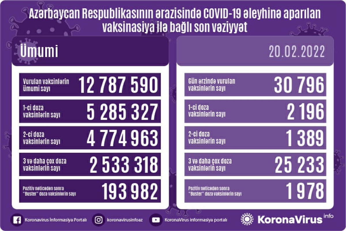Azərbaycanda son sutkada koronavirus (COVID-19) əleyhinə 30 796 vaksin vurulub. Bir gündə birinci mərhələ üzrə vaksinasiya olunanların sayı 2 196, ikinci mərhələ üzrə vaksinasiya olunanların sayı 1 389, buster doza üzrə vaksinasiya olunanların sayı isə 25 233 nəfərdir.