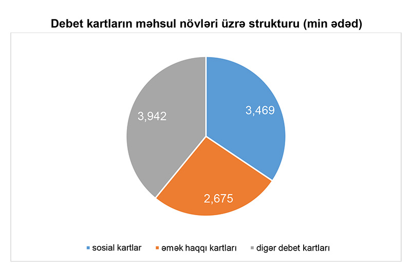 Emissiya edilən ödəniş kartlarının 88%-ni (10.1 mln. ədəd) debet kartlar, 12%-ni (1.4 mln. ədəd) isə kredit kartları təşkil etmişdir.