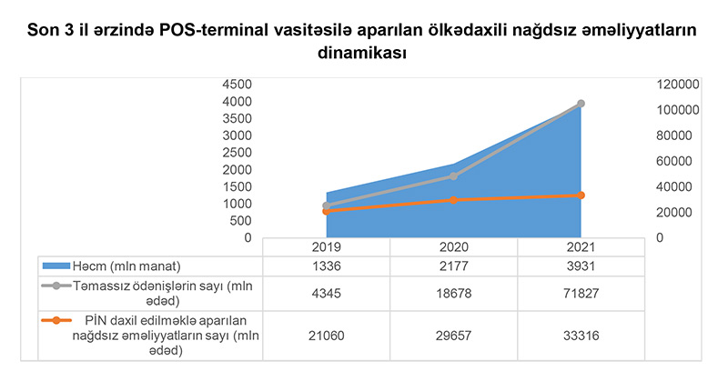 Təsərrüfat subyektlərində 2021-ci il ərzində POS-terminal vasitəsilə aparılan nağdsız əməliyyatların sayı 2020-ci il ilə müqayisədə 2.2 dəfə artaraq 105 mln. ədəd, həcmi isə 80% artaraq 3.9 mlrd. manat olmuşdur. O cümlədən, 2021-ci il ərzində POS-terminallarla aparılan təmassız ödənişlərin sayı 2020-ci il ilə müqayisədə 3.8 dəfə artaraq 71.8 mln. ədəd, həcmi isə 5.2 dəfə artaraq 2.6 mlrd. manat olmuşdur.