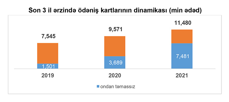 2020-ci il ilə müqayisədə ödəniş kartlarının sayı 20%, o cümlədən təmassız kartların sayı 2 dəfə artmışdır.