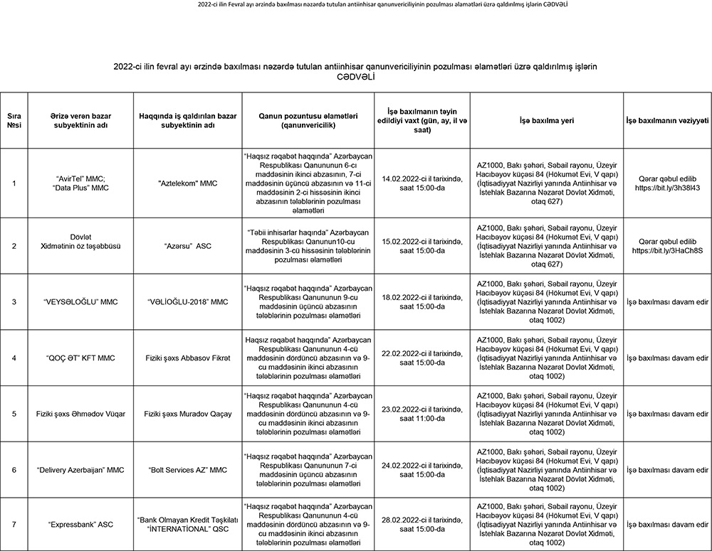 Antiinhisar qanunvericiliyinin pozulması əlamətləri üzrə qaldırılan işlər barədə məlumatlar açıqlandı - CƏDVƏL