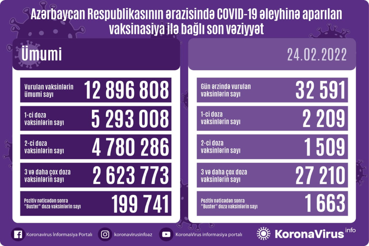 Azərbaycanda son sutkada koronavirus (COVID-19) əleyhinə 32 591 vaksin vurulub. Bir gündə birinci mərhələ üzrə vaksinasiya olunanların sayı 2 209, ikinci mərhələ üzrə vaksinasiya olunanların sayı 1 509, üç və daha çox doza vaksin vurduranların sayı 27 210, pozitiv nəticədən sonra buster doza üzrə vaksinasiya olunanların sayı isə 1 663 nəfərdir.
