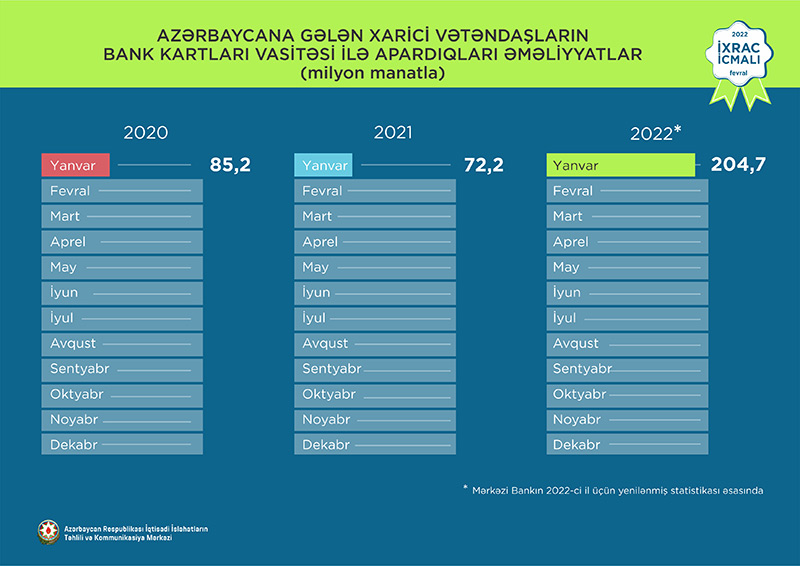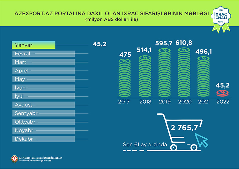 Normallaşma prosesinin davam etdiyi dövrdə 2022-ci ilin yanvar ayı ərzində yeyinti məhsulları üzrə ixrac ötən ilin müvafiq ayı ilə müqayisədə 31% artaraq 60,2 milyon ABŞ dolları, qeyri-yeyinti məhsulları üzrə isə 71,9% artaraq 172 milyon ABŞ dolları təşkil edib.