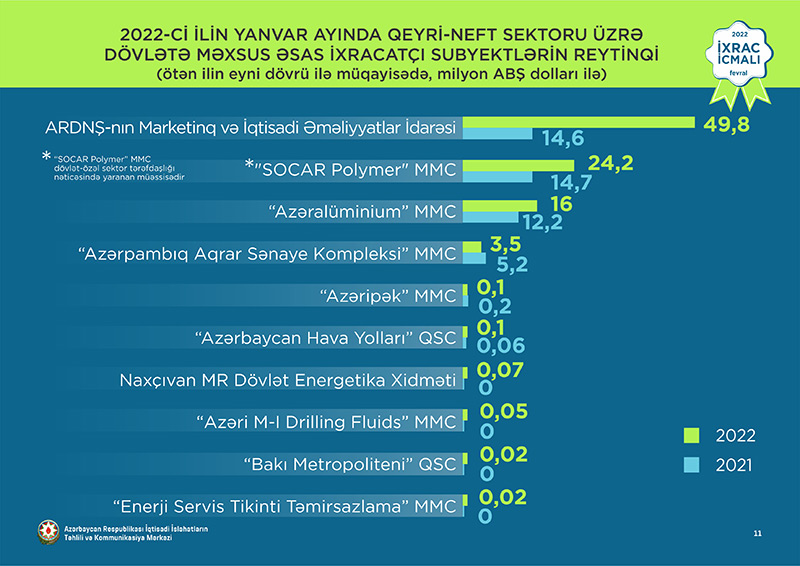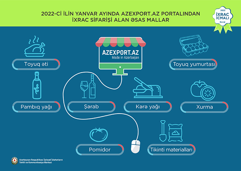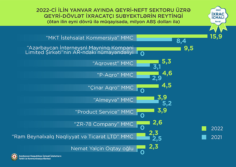 2022-ci ilin yanvar ayında ixrac edilən qeyri-neft sektoruna aid malların siyahısında pambıq mahlıcı (22,2 milyon ABŞ dolları) birinci, xurma (17,1 milyon ABŞ dolları) ikinci və meşə fındığı (15,9 milyon ABŞ dolları) üçüncü olub.
