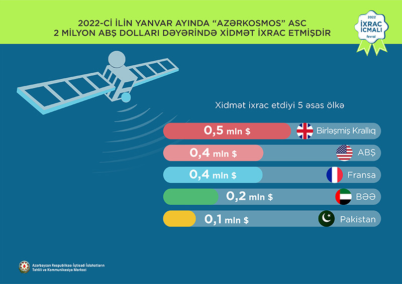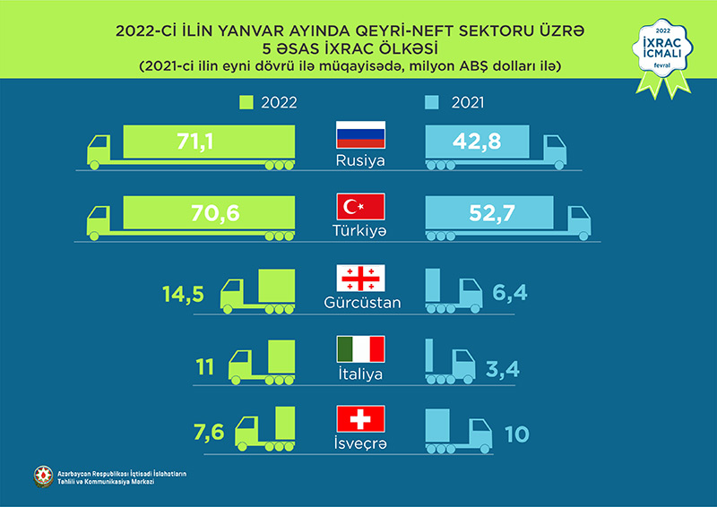 2022-ci ilin yanvar ayında qeyri-neft sektoruna aid ən çox mal ixrac edilən ölkələrin siyahısında Rusiya Federasiyası (71,1milyon ABŞ dolları) birinciliyə yüksəlib. Bu siyahıda Türkiyə ikinci (70,6 milyon ABŞ dolları) və Gürcüstan üçüncü (14,5 milyon ABŞ dolları) olub.