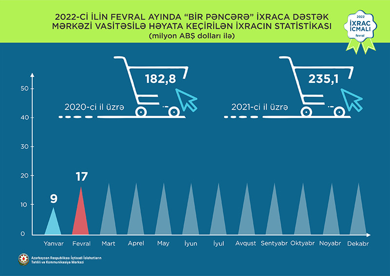 Marja xəbər verir ki, “İxrac icmalı” nın fevral sayına əsasən, 2022-ci ilin yanvar ayı ərzində Azərbaycanın ixracı 3,1 mlrd. ABŞ dolları, qeyri-neft sektoru üzrə 232,2 mln. ABŞ dolları təşkil edib. Qeyri-neft sektoru üzrə ixrac 2021-ci il ilə müqayisədə 86,2 mln. ABŞ dolları və ya 59% artıb.