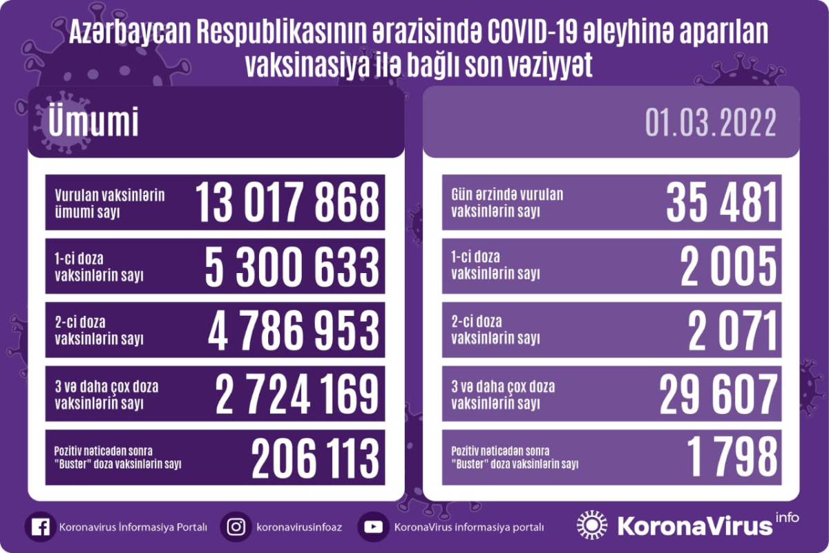 Azərbaycanda son sutkada koronavirus (COVID-19) əleyhinə 35 481 vaksin vurulub. Bir gündə birinci mərhələ üzrə vaksinasiya olunanların sayı 2005, ikinci mərhələ üzrə vaksinasiya olunanların sayı 2071, 3 və daha çox doza üzrə vaksinasiya olunanların sayı 29607, pozitiv nəticədən sonra buster doza olunanların sayı isə 1798 nəfərdir.