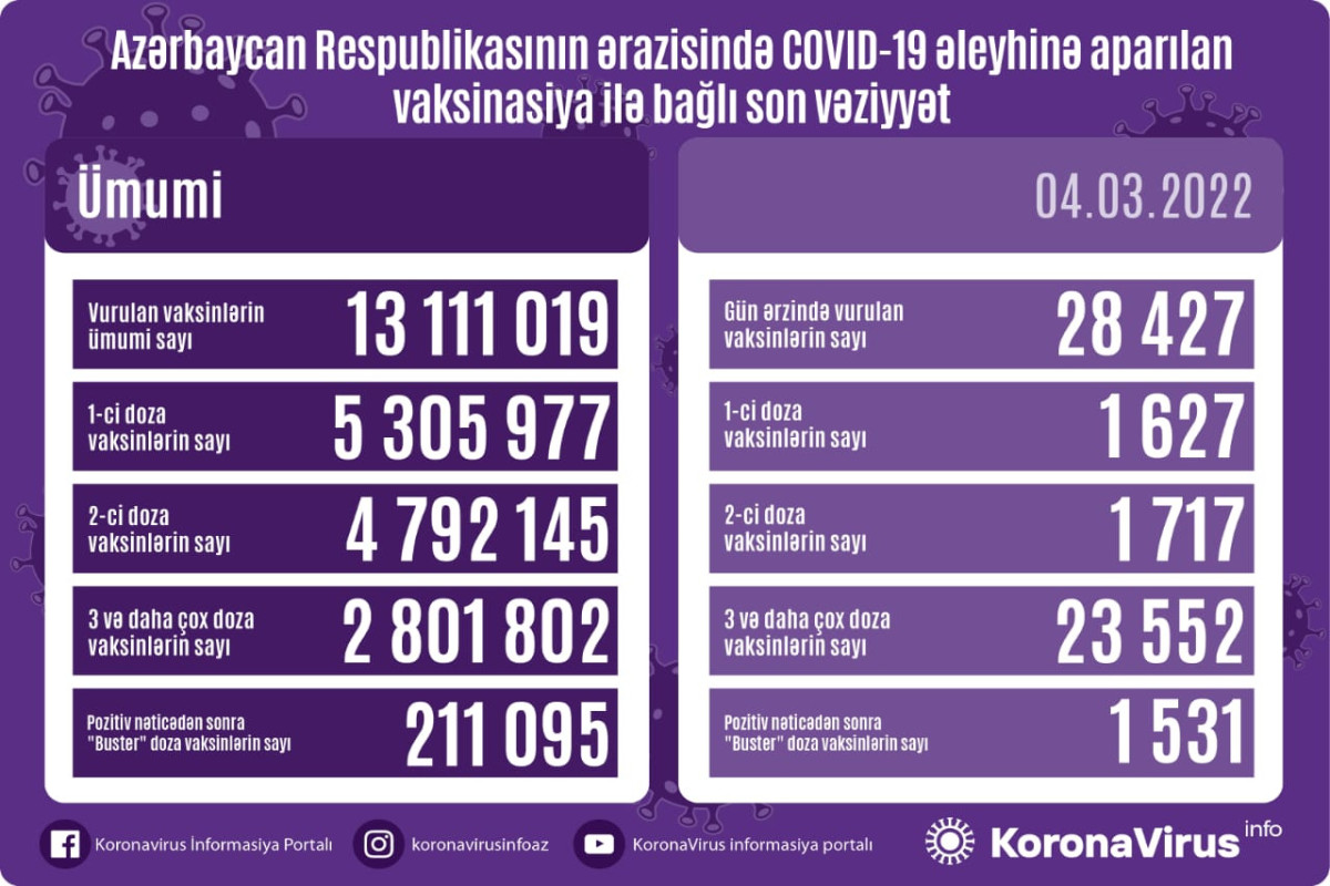 Azərbaycanda son sutkada koronavirus (COVID-19) əleyhinə 28 427 vaksin vurulub. Bir gündə birinci mərhələ üzrə vaksinasiya olunanların sayı 1 627, ikinci mərhələ üzrə vaksinasiya olunanların sayı 1 717, üç və daha çox doza üzrə vaksinasiya olunanların sayı 23 552, pozitiv nəticədən sonra buster doza üzrə vaksinasiya olunanların sayı 1 531 nəfərdir.