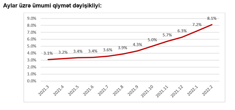 “Veysəloğlu Pərakəndə İndeksi”nə görə, 2022-ci ilin fevral ayı üzrə müştərilərin ən çox aldığı məhsulların qiymətində keçən ilin fevral ayına nisbətən 12,6% artım müşahidə edilib. Belə ki, tez köhnələn qida məhsullarının qiymətində keçən ilin fevral ayına nisbətən 12,8% artım, quru, dondurulmuş qida məhsullarının, şirniyyat və spirtsiz içkilərin qiymətində 13,5% artım, spirtli içkilər və tütün məmulatlarının qiymətində isə 10,0% artım izlənilib.