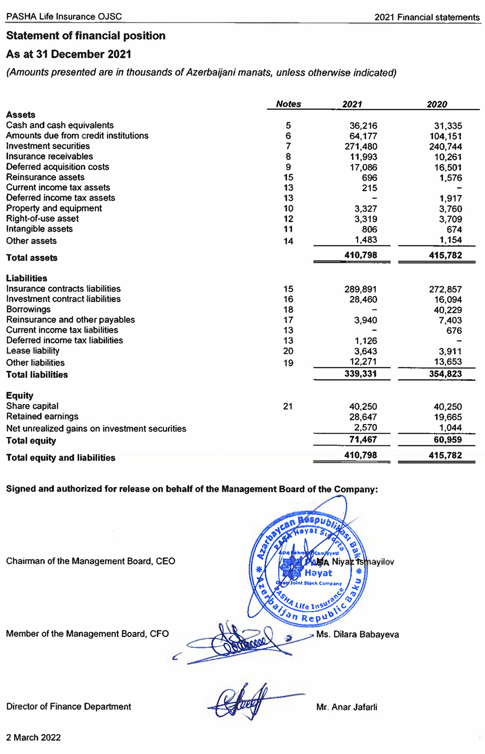 Ən dayanıqlı şirkətlərdən olan PAŞA Həyat-ın məcmu aktivləri 2021-ci ilin 31 dekabr tarixinə 410.8 milyon manat təşkil edib.