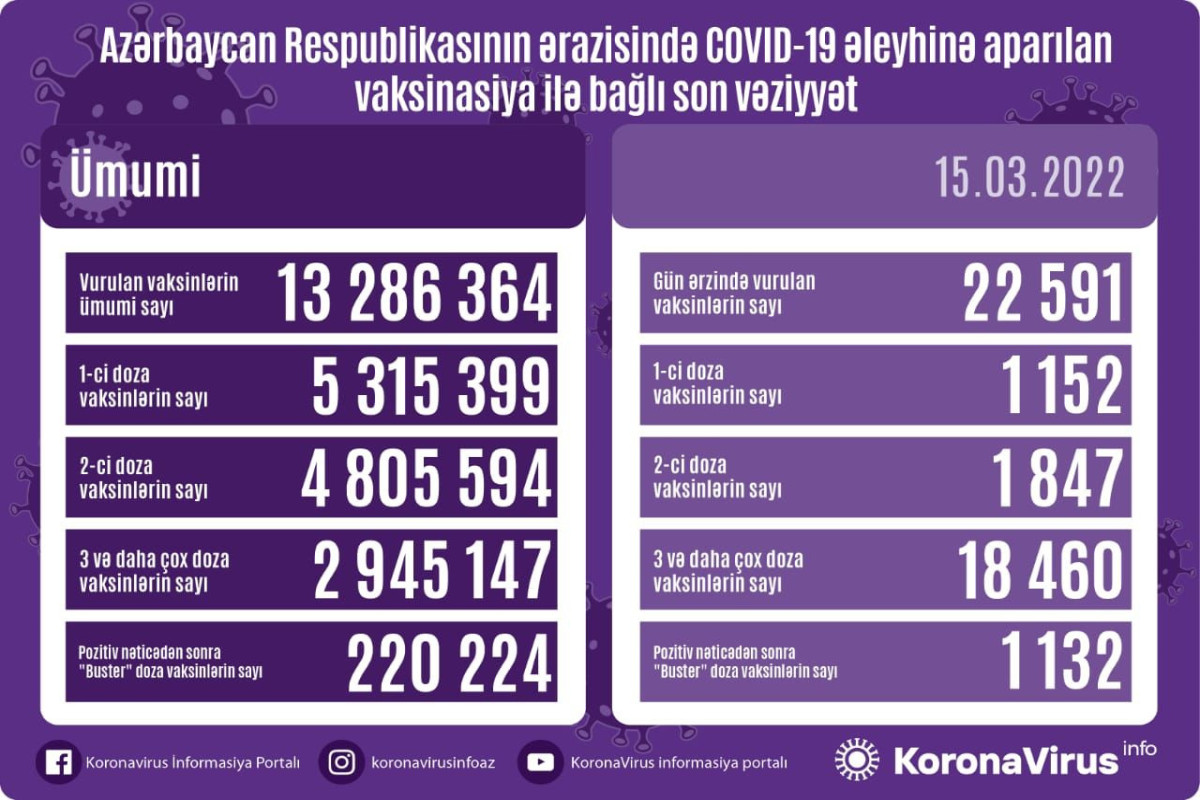 Azərbaycanda son sutkada koronavirus (COVID-19) əleyhinə 22 591 vaksin vurulub. Bir gündə birinci mərhələ üzrə vaksinasiya olunanların sayı 1152, ikinci mərhələ üzrə vaksinasiya olunanların sayı 1847, 3-cü və daha çox doza üzrə vaksinasiya olunanların sayı 18 460, pozitiv nəticədən sonra buster doza olunanların sayı isə 1132 nəfərdir.