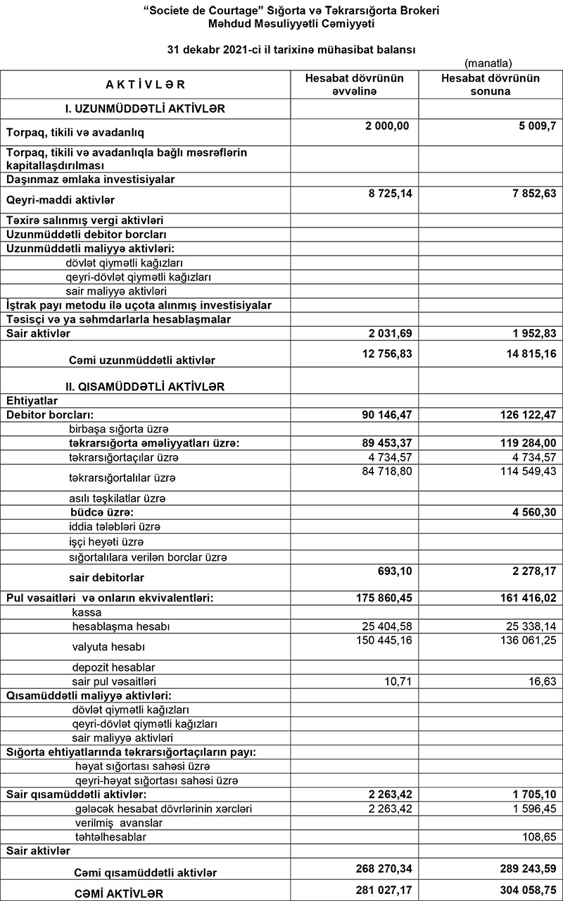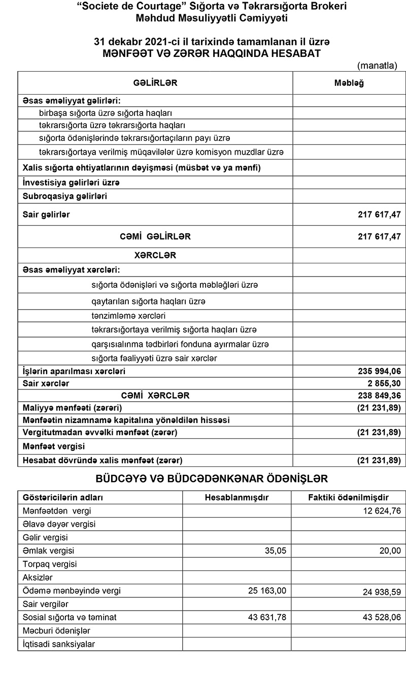 “Societe de Courtage” Sığorta və Təkrarsığorta Brokeri Məhdud Məsuliyyətli Cəmiyyəti 2021-ci ili 21 min 232 manat xalis zərər ilə başa vurub. Şirkət 2020-ci ili 8 min 888 manat xalis mənfəət ilə bağlamışdı.