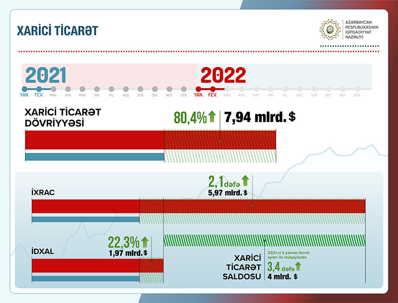 İqtisadiyyat naziri Mikayıl Cabbarov bildirib ki, ilk 2 ayda xarici ticarət dövriyyəsi 80,4% artaraq 7,94 mlrd. dollar, ixrac 2,1 dəfə artaraq 5,97 milyard dollar, idxal isə 22,3% artaraq 1,97 mlrd. dollar təşkil edib.