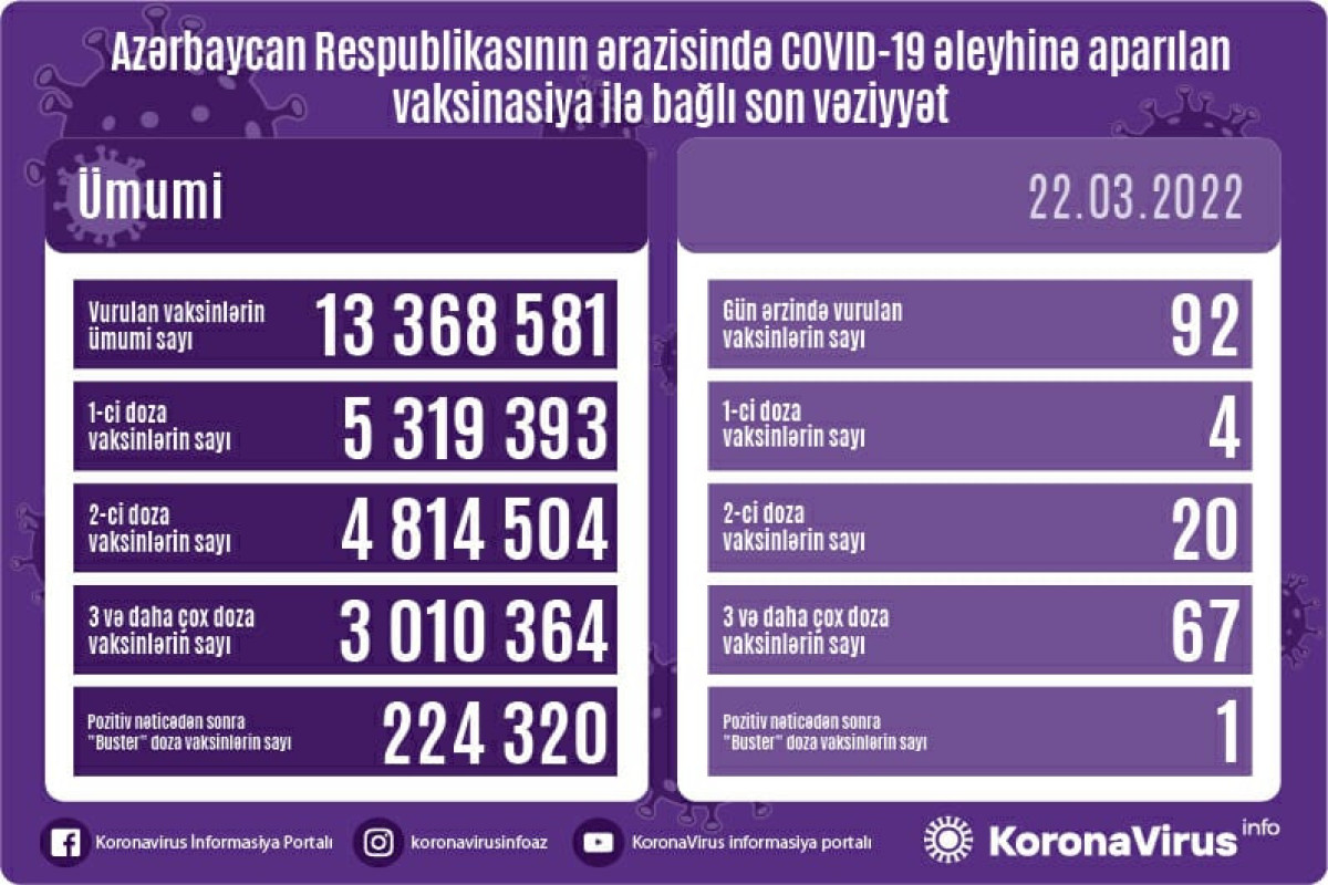 Azərbaycanda son sutkada koronavirus (COVID-19) əleyhinə 92 vaksin vurulub. Bir gündə birinci mərhələ üzrə vaksinasiya olunanların sayı 4, ikinci mərhələ üzrə vaksinasiya olunanların sayı 20, 3-cü və daha çox doza üzrə vaksinasiya olunanların sayı 67, pozitiv nəticədən sonra buster doza olunanların sayı isə 1 nəfərdir.