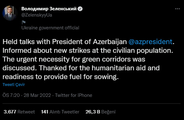 Marja xəbər verir ki, Ukrayna Prezidenti Vladimir Zelenski ilə Azərbaycan Prezidenti İlham Əliyev arasında telefon danışığı olub. Danışıq zamanı Əliyevin yanacaq dəstəyi vəd etdiyini açıqlayan Zelenski, "Azərbaycan Prezidenti ilə söhbətimizdə mülki əhaliyə qarşı hücumların əhəmiyyəti və humanitar dəhlizlərin aktuallığı müzakirə olundu. O, buna hazır olduğunu söylədi. Humanitar yardım və əkin dövrü üçün yanacaq dəstəyi təmin ediləcək”,- qeyd edib.