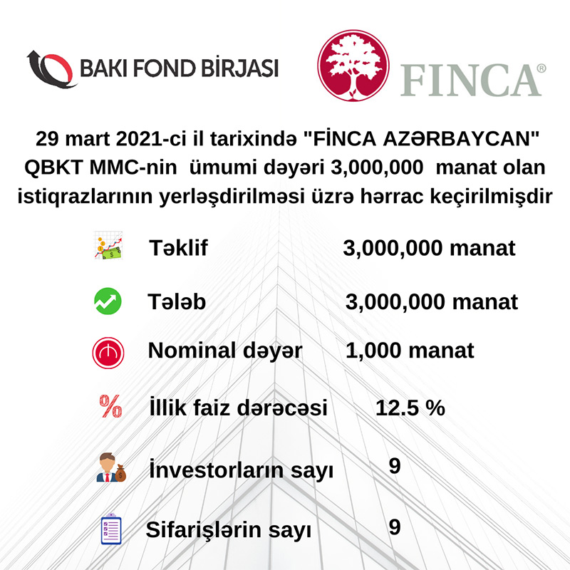 29 mart 2022-ci il tarixində Bakı Fond Birjasında "FİNCA AZƏRBAYCAN" QBKT MMC-nin tədavül müddəti 2 təqvim ili olan AZ2003019208 dövlət qeydiyyat nömrəli, 3 milyon manat həcmində, faizli, təmin edilməmiş sənədsiz, adlı istiqrazlarının yerləşdirilməsi üzrə hərrac yekunlaşıb.