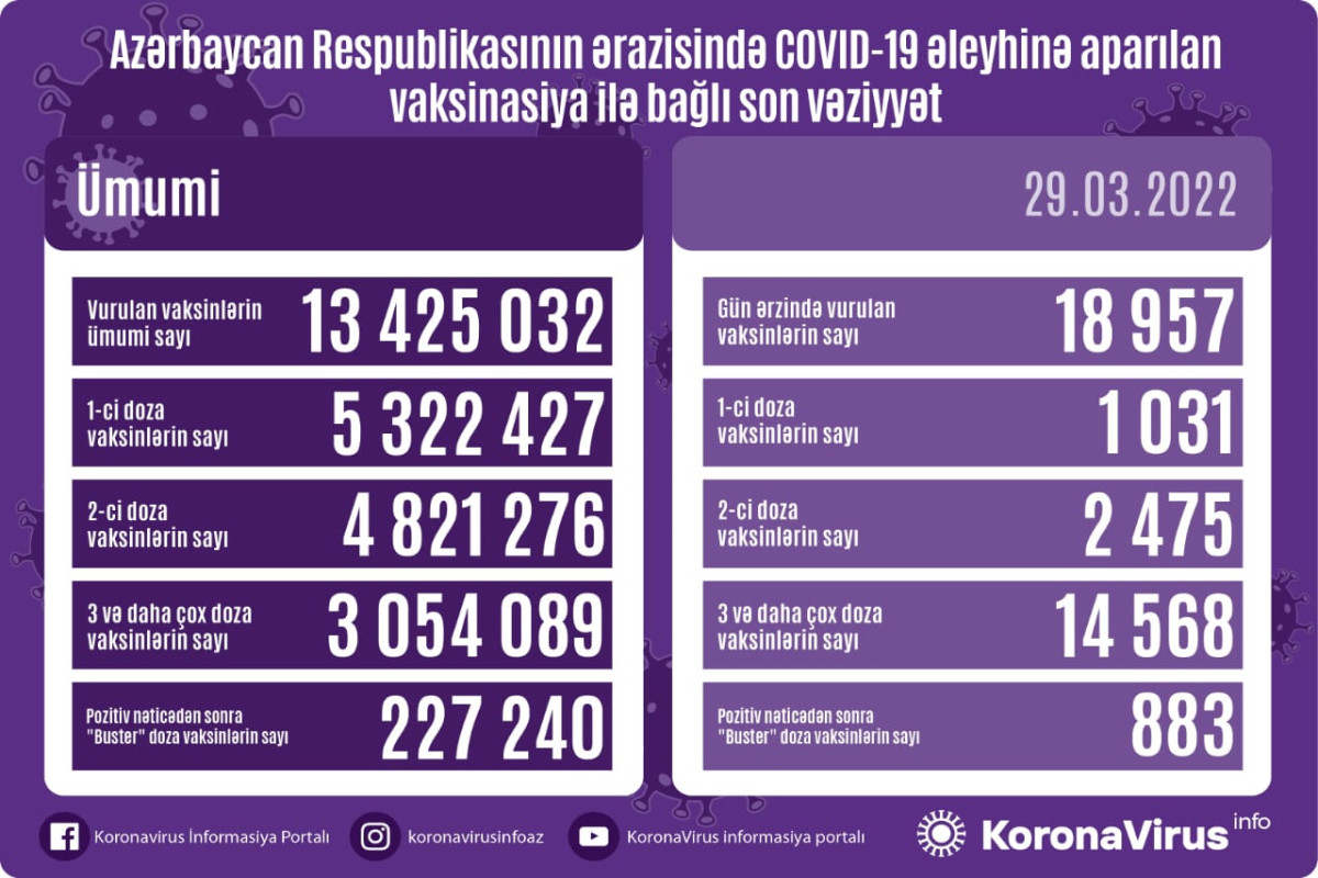 Azərbaycanda son sutkada koronavirus (COVID-19) əleyhinə 18 957 vaksin vurulub. Bir gündə birinci mərhələ üzrə vaksinasiya olunanların sayı 1031, ikinci mərhələ üzrə vaksinasiya olunanların sayı 2475, üç və daha çox doza üzrə vaksinasiya olunanların sayı 14568, pozitiv nəticədən sonra buster doza üzrə vaksinasiya olunanların sayı 883 nəfərdir.