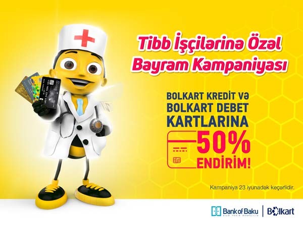 Bankın ayırdığı kredit xəttindən istifadə imkanı yaradan Bolkart kredit və şəxsi vəsaitdən istifadə üçün nəzərdə tutulmuş Bolkart debet kartlarını əldə etmək istəyən tibb işçiləri aşağıdakı kartları 50% endirimlə əldə edə bilərlər: