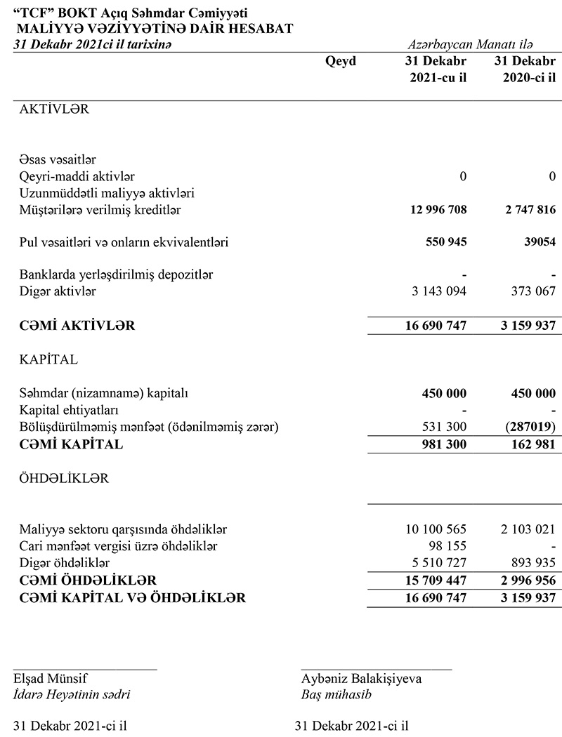 "TCF" BOKT Açıq Səhmdar Cəmiyyəti 2021-ci ili 818 min 319 manat xalis mənfəət ilə başa vurub.