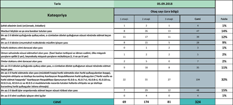 Statistik məlumatları nəzərə alaraq qeyd edim ki, təkcə 5 sentyabr 2018-ci il tarixində Mənzil İnşaatı Dövlət Agentliyinin birinci layihəsi olan Yasamal Yaşayış Kompleksində 324 mənzildən, yalnız 4 şəhid ailəsi ev əldə edə bildi, ümumi iştirakçıların sayı isə 4542 nəfər idi.“Güzəştli mənzil” sistemində elektron kabinet əldə etmiş şəxslərin sayı isə 9556 nəfər idi. Həmin dövrü əhatə edən statistika şəkildə izləyə bilərsiniz.