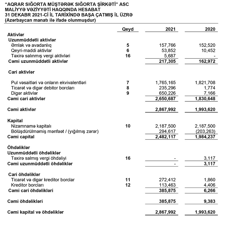 31 Dekabr 2021-ci il tarixində “Aqrar Sığorta Müştərək Sığorta Şirkəti” ASC 2 milyon 867 min 992 manat cəmi aktivlərə və 385 min 875 manat cəmi öhədliklərə malik olub. Şirkət 2020-ci ilin sonunda 1 milyon 993 min 620 manat cəmi aktivlərə 6 min 266 manat cəmi öhdəliklərə malik idi.