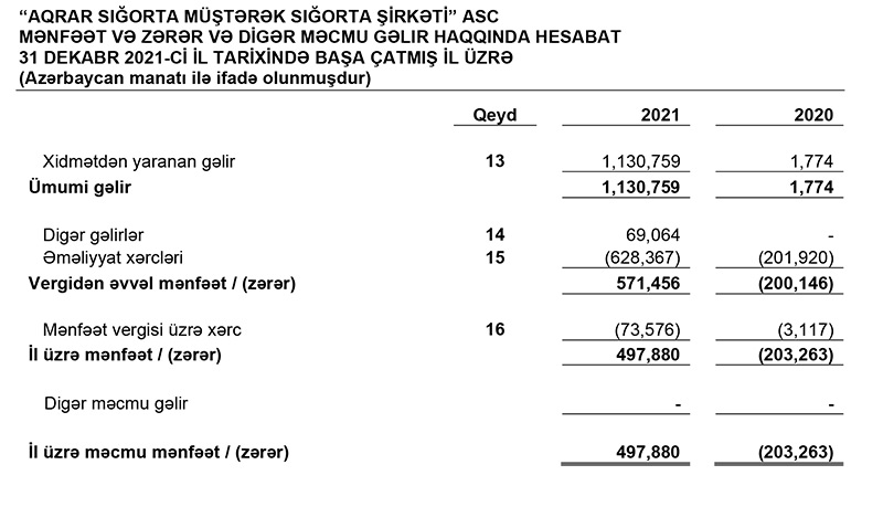 Aqrar Sığorta Fondunun əməliyyat şirkəti “Aqrar Sığorta Müştərək Sığorta Şirkəti” ASC 2021-ci ili 497 min 880 manat xalis mənfəət ilə başa vurub. Halbuki, Şirkət təsis edildiyi 2020-ci ili 203 min 263 manat xalis zərər ilə bağlamışdı.