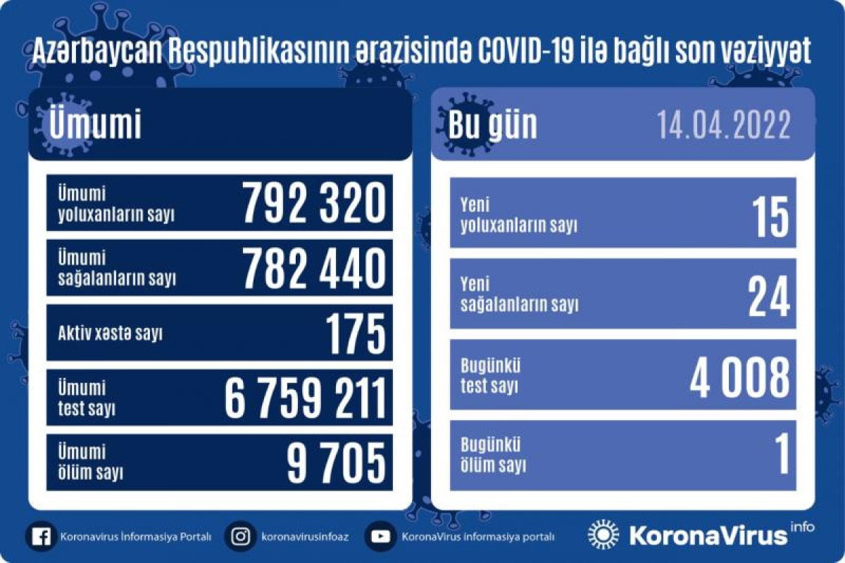 Azərbaycanda koronavirus (COVID-19) infeksiyasına 15 yeni yoluxma faktı qeydə alınıb, 24 nəfər müalicə olunaraq sağalıb.
